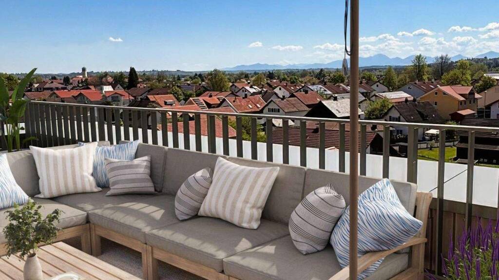 . Moderne Architektur mit klaren Linien und funktionalem Grundriss . Penthouse-Wohnung mit Alpenblick . Dachterrasse mit Holzbodenbelag . Wohngesunde Materialien und nachhaltige Baustoffe für ein angenehmes Raumklima . Hochwertige Ausstattung mit stilvollen Details und langlebigen Oberflächen . Hybridbauweise mit massiven Holzwänden aus einheimischen, europäischen Hölzern . KfW-40-EE-Bauweise - energieeffizient und förderfähig . Holzfenster mit Dreifachverglasung - nachhaltig, schall- und wärmedämmend . Fußbodenheizung für behagliche Wärme in allen Räumen . Elektrische Rollläden - komfortabel und energiesparend . Enorme Steuerersparnis dank 5% degressive + 5% Sonder-Abschreibung