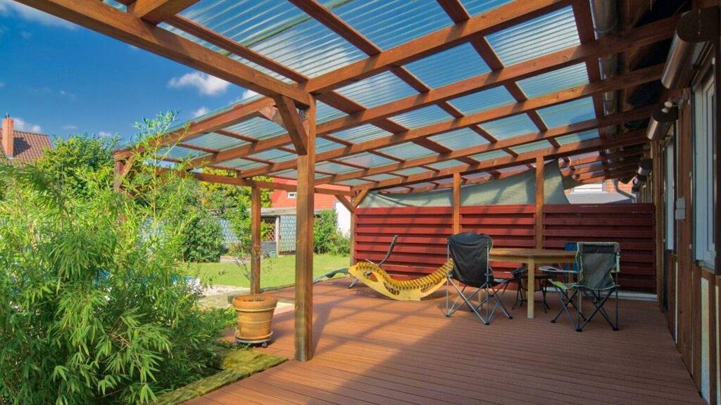 -Sonnige Terrasse mit Gartenblick