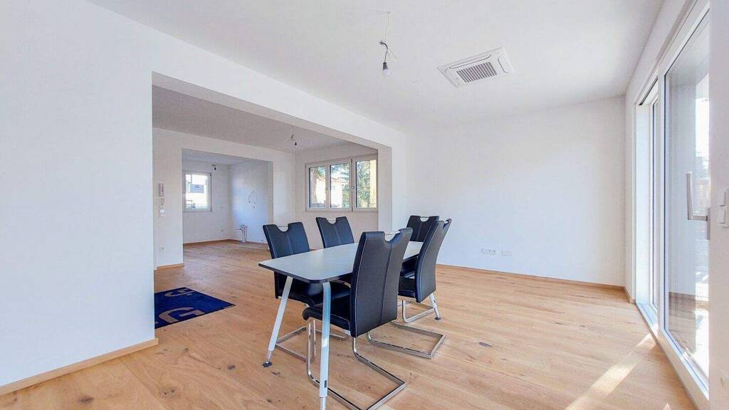 Besonderer Wert wurde auf eine nachhaltige und komfortable Ausstattung gelegt. Die Fußbodenheizung im gesamten Haus ist in allen Wohnräumen separat regulierbar und sorgt gemeinsam mit der integrierten Kühlfunktion sowie der Klimaanlage in allen Wohnräumen ganzjährig für ein angenehmes Raumklima. Hochwertige Holz-Alu-Fenster mit 3-fach-Isolierverglasung, moderne Rollläden an allen Fenstern und Terrassentüren sowie eine flügelüberdeckende Aluminium-Eingangstüre von Hörmann unterstreichen den hohen Qualitätsstandard. Für zusätzliche Sicherheit sorgt das patentierte Schließsystem der Marke Evva mit 100-prozentigem Kopierschutz.