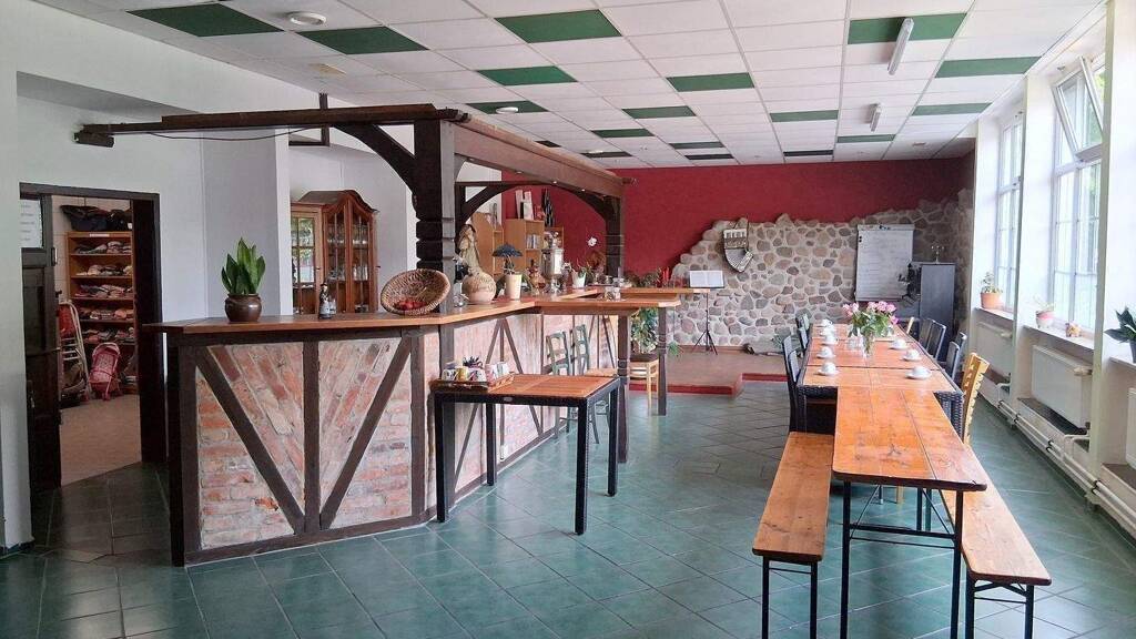 Küchenbereich: Ca. 12 m², gefliest und funktional gestaltet, bietet ausreichend Platz für die Zubereitung von Speisen und Getränken. Die Küche ist mit den notwendigen Anschlüssen ausgestattet, um einen reibungslosen Betrieb zu gewährleisten. –