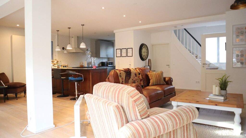 Das Haus wurde liebevoll saniert und durch einen Anbau im Erdgeschoss erweitert, wobei darauf geachtet wurde, den Charme des Hauses durch die Auswahl von hochwertigen Materialien an Wand (z.B. handgefertigte Fliesen aus England) und Boden (Echtholz-Dielen und Naturstein-Bodenfliesen) zu unterstreichen. In die Einbauküche aus grau lackiertem Massivholz wurde zudem eine Original Theke aus der Gründerzeit integriert, welche fachmännisch restauriert und somit für diesen Zweck vollständig nutzbar ist. Küche und Theke sind durch eine hochwertige Granit-Arbeitsplatte verbunden. Die Bäder wurden äußerst modern und sehr aufwendig mit viel Liebe zum Detail gestaltet, bei der Materialauswahl wurden beispielweise wandhoch weiße Fließen im Fischgrätmuster verlegt sowie Naturschiefer als Bodenbelag verwendet.
