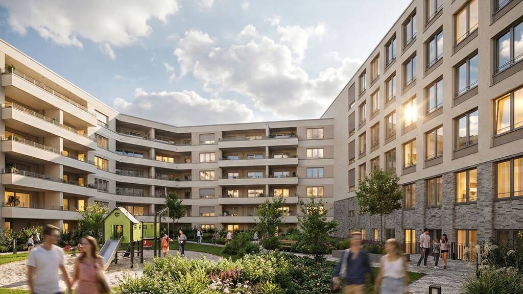 Ein besonderes Highlight ist der begrünte, gemeinschaftlich nutzbare Innenhof, der als ruhiger Rückzugsort innerhalb des urbanen Umfelds dient. Ein integrierter Spielplatz ergänzt das Angebot und macht die Anlage auch für Familien besonders attraktiv.