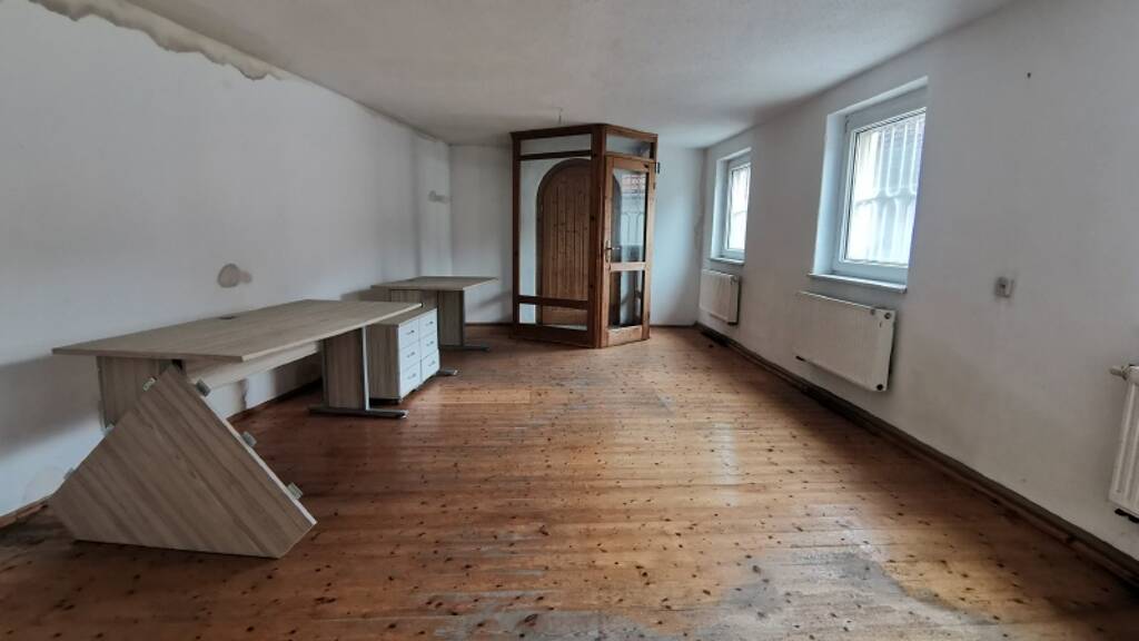 Angeboten wird ein ca. 100 Jahre altes Wohn- und Geschäftshaus. In der unteren Etage befinden sich Büroräume und eine Tischlerwerkstatt, im Obergeschoss ( 110 m²) und zusätzlich im Dachgeschoss wurden die Wohnräume eigerichtet. Gegenüber finden Sie die Garage.