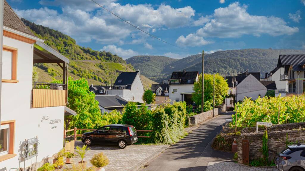 Das beschriebene Haus befindet sich in Zell-Kaimt, auf der gegenüberliegenden Moselseite der Stadt Zell. Zell liegt in Rheinland Pfalz und bietet als einer der beliebtesten Weinorte der Mittelmosel viele touristische Attraktionen und eine schöne Fußgängerzone mit unzähligen Weinlokalen und kleinen Geschäften. Außerdem findet man hier eine hervorragende Infrastruktur mit einem Einkaufszentrum, Grund- und fortführenden Schulen, Krankenhaus und einem Schwimmbad. Die Lage ist ideal für Ausflüge zu den Sehenswürdigkeiten der Mittelmosel, sowie für Wander- und Fahrradtouren in der Umgebung. Cochem und Bernkastel Kues sind rund 40km weit entfernt. Dank der Nähe zum Flughafen Frankfurt-Hahn (15 km) und einem gut ausgebauten Straßennetz, ist Zell sehr gut aus allen Teilen Deutschlands und Europas erreichbar. Die nächste Bahnanbindung ist in Bullay, rund 4 km entfernt.