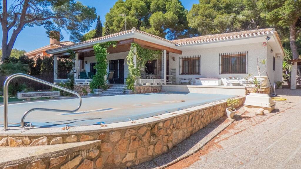 Ebenerdige Villa in einer der besten Lagen in ganz Campoamor, weniger als 300 Meter vom Strand entfernt. Lassen Sie sich das nicht entgehen, denn Immobilien an diesem Standort stehen nicht sehr oft zum Verkauf. Wenn Sie das Grundstück betreten, haben Sie auf der rechten Seite eine große Auffahrt und am Ende einen Carport mit ausreichend Platz für 4-5 Autos. Als nächstes haben Sie einen schönen Pool, der 9 x 4 Meter groß ist, und links davon befindet sich ein Gut gestalteter Garten mit einer Vielzahl von Pflanzen und Sträuchern, die für viel Farbe sorgen. Das Anwesen wurde 1971 erbaut und besteht aus sechs Schlafzimmern und vier Badezimmern. Wenn Sie das Anwesen selbst betreten, haben Sie einen Flur, der zu Ihrer Rechten und auch nach oben und zu Ihrer Linken führt. Gleich zu Ihrer Linken befindet sich der Wohnbereich, den die Eigentümer sowohl in einen Wohn- als auch in einen Essbereich umgewandelt haben, es gibt Türen zu einer überdachten Terrasse mit Blick auf den Garten. Gehen Sie zurück ins Innere und weiter, finden Sie eine große Küche, die gut durchdacht ist. Daran schließt sich ein Familienduschraum an. Wenn Sie diesen Teil des Flurs hinaufgehen, finden Sie auf der rechten Seite einen Einbauschrank. und vor Ihnen liegen zwei geräumige Gästezimmer.