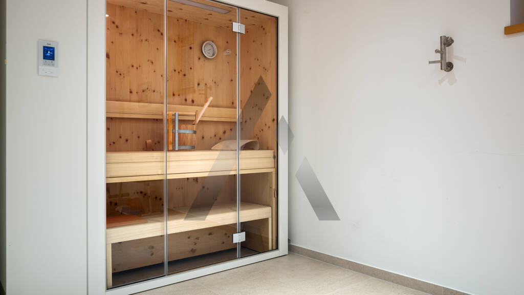 Weiters verfĂĽgt diese Wohnung ĂĽber zwei sehr groĂźzĂĽgige Schlafzimmer mit zwei Badezimmern en Suite, sowie einen Wellnessraum mit Sauna.