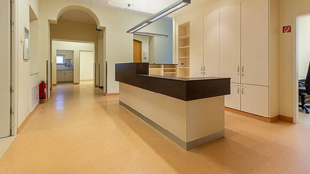 Bereich links: Eingangsflur (über wenige Stufen oder mit Aufzug erreichbar), zwei separate Toiletten, sieben Behandlungs-/Sprechzimmer oder Büros - davon zwei sehr große Räume, Empfangs-/Anmeldebereich, offene Teeküche mit Sitzgelegenheit, zwei Abstellräume