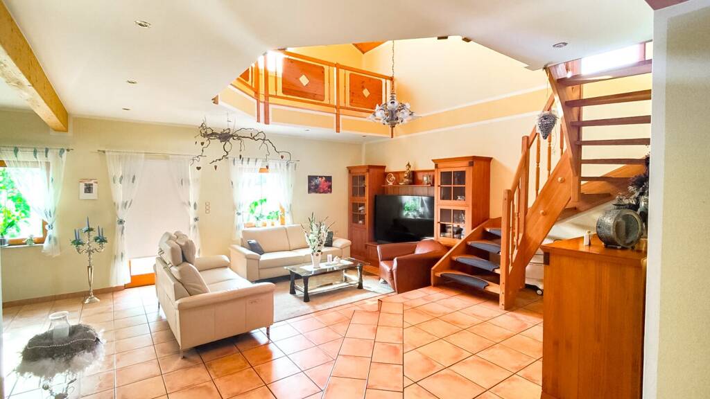 Das Wohnhaus erstreckt sich über drei Ebenen: Erdgeschoss, Obergeschoss sowie einen ausgebauten Kellerbereich. Im Erdgeschoss liegt der offene Wohn- und Essbereich mit hochwertiger Einbauküche, ein separates Gäste-WC sowie das großzügige Wohnzimmer mit Galerie und direktem Zugang zur überdachten Terrasse.