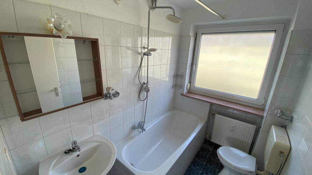 Das Badezimmer verfügt über eine Badewanne, WC und ein Fenster zur Strasse.