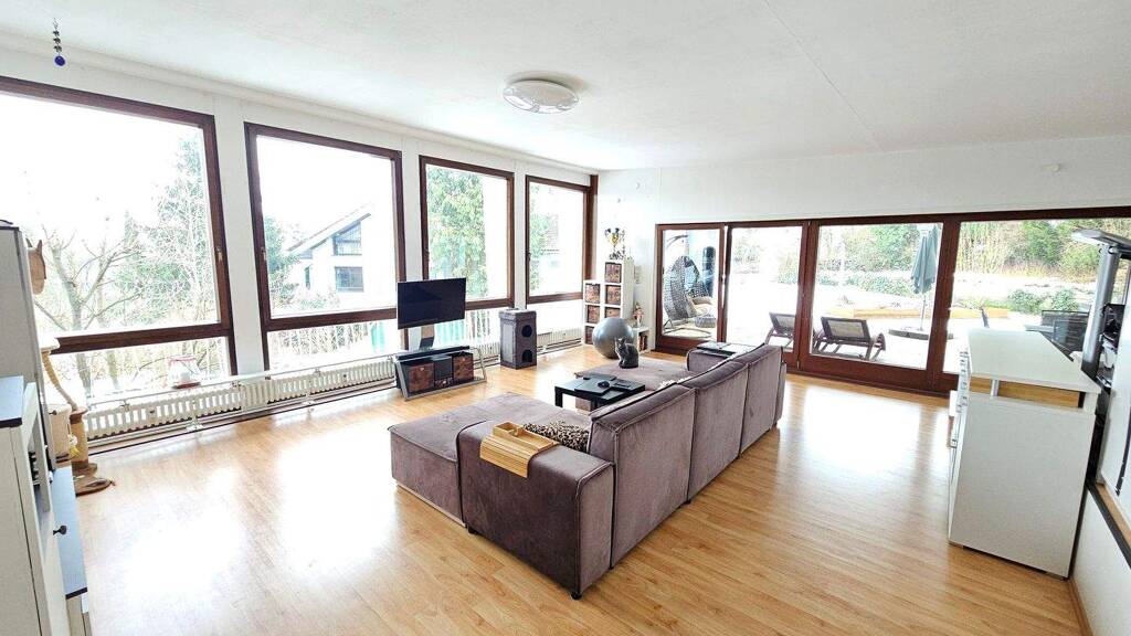 Sie befindet sich im 1. Obergeschoss eines architektonisch ausgefallenen 4-Familienhauses auf einem wunderschönen, parkähnlichen Anwesen am Ende einer Stichstraße - herrlich ruhig & naturnah.