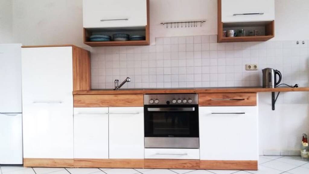 - Separate, geflieste Küche mit einer neuwertigen Einbauküche, Küchentisch und vier Stühlen; die Küche wird vom Vermieter unentgeltlich zur Nutzung zur Verfügung gestellt.
