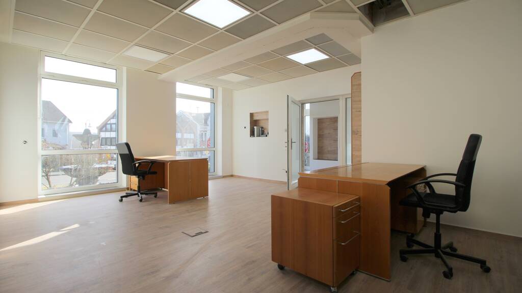 Sie profitieren von einem repräsentativen Eingangsbereich mit automatischer Schiebetür und großzügigen modernen Büro-, Praxis- oder Verkaufsflächen. Die Gewerbefläche teilt sich aktuell in eine Großfläche mit ca. 87 m² und drei Büros mit ca. 35 m², ca. 22 m² und ca. 12 m² auf. Alle Räume sind mit großen Fensterflächen versehen und sind somit hell und freundlich. Das Beleuchtungskonzept sorgt für zusätzliche Helligkeit. Sollte es zu hell sein, sorgen Jalousien für Verschattungsmöglichkeiten. Eine Teeküche, sanitären Anlagen sowie weitere Neben- und Kellerräume befinden sich im Untergeschoss.