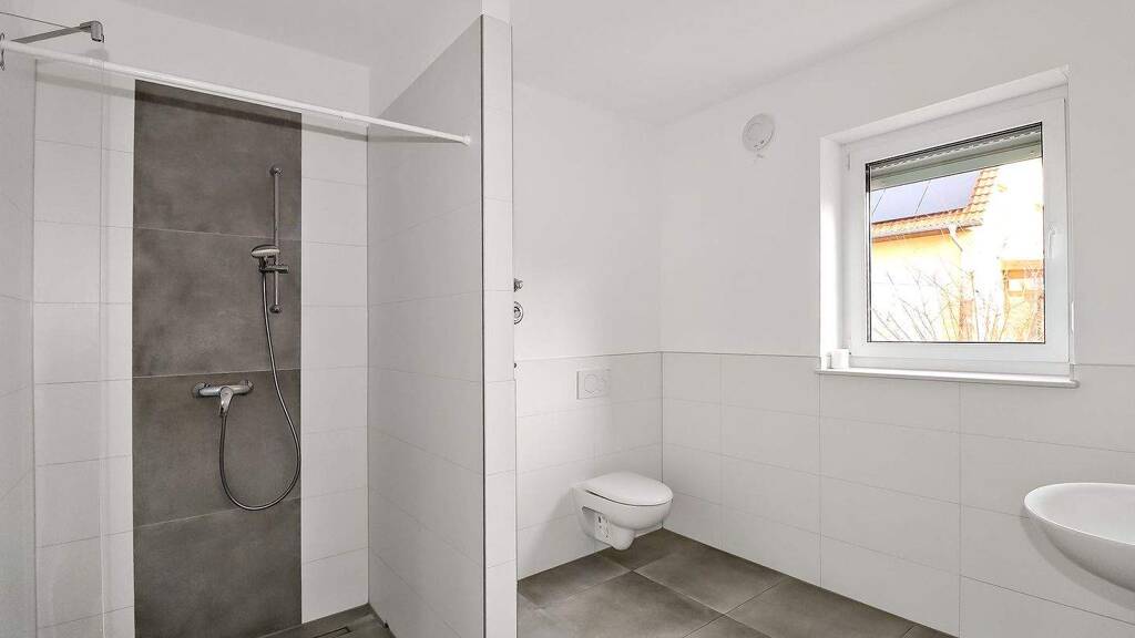 - Tageslichtbad mit groĂźer bodentiefer Dusche und Waschmaschinenanschluss