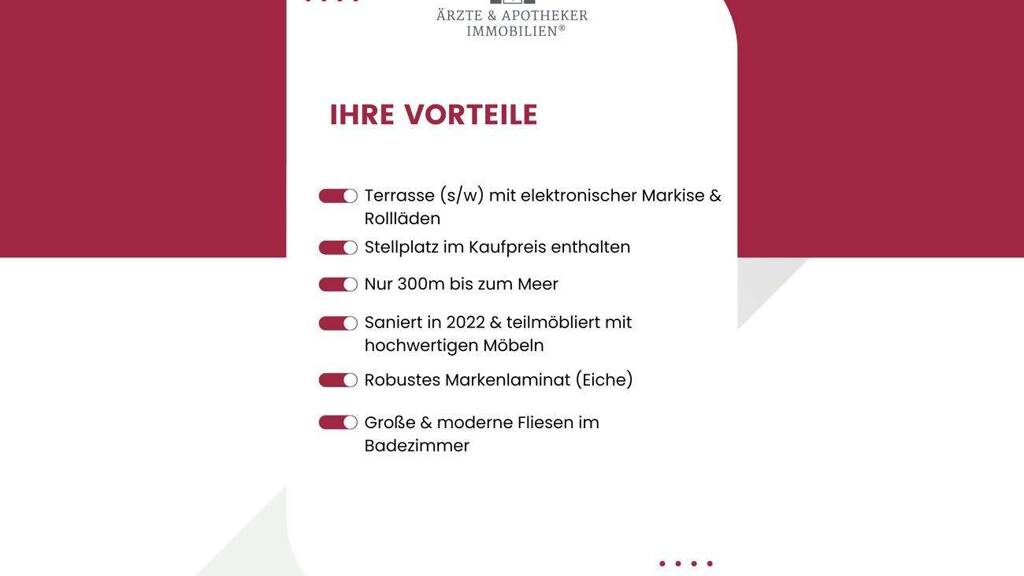 Diese Lage vereint das Beste aus zwei Welten: die Nähe zum Meer und die Ruhe eines gepflegten Wohnumfelds - ideal für alle, die das Besondere suchen und das Gefühl von Urlaub jeden Tag erleben möchten.