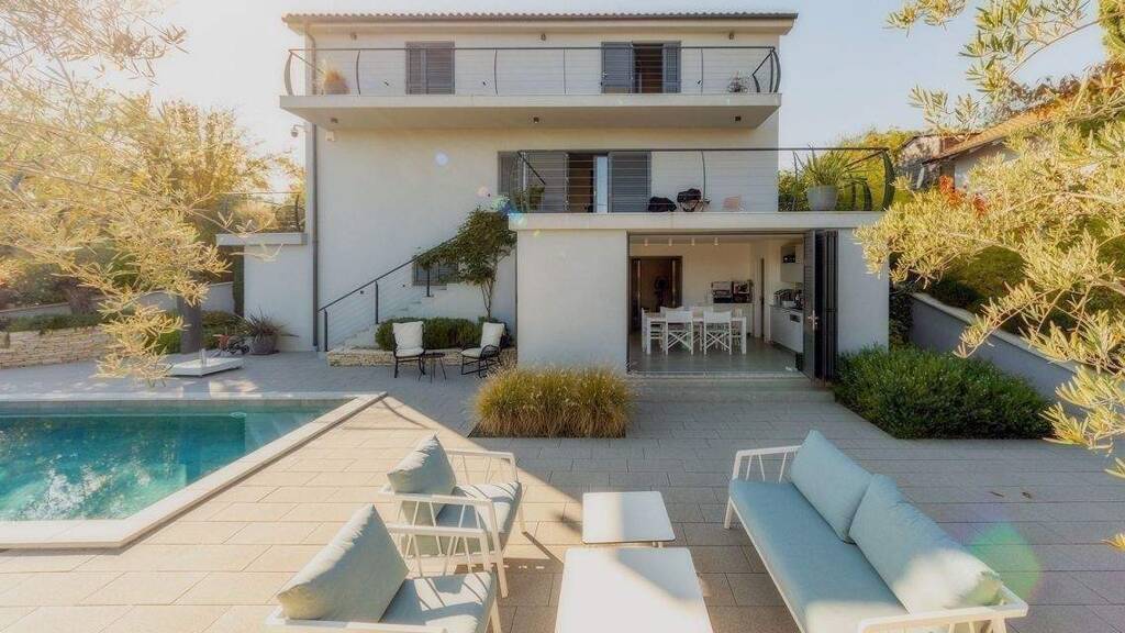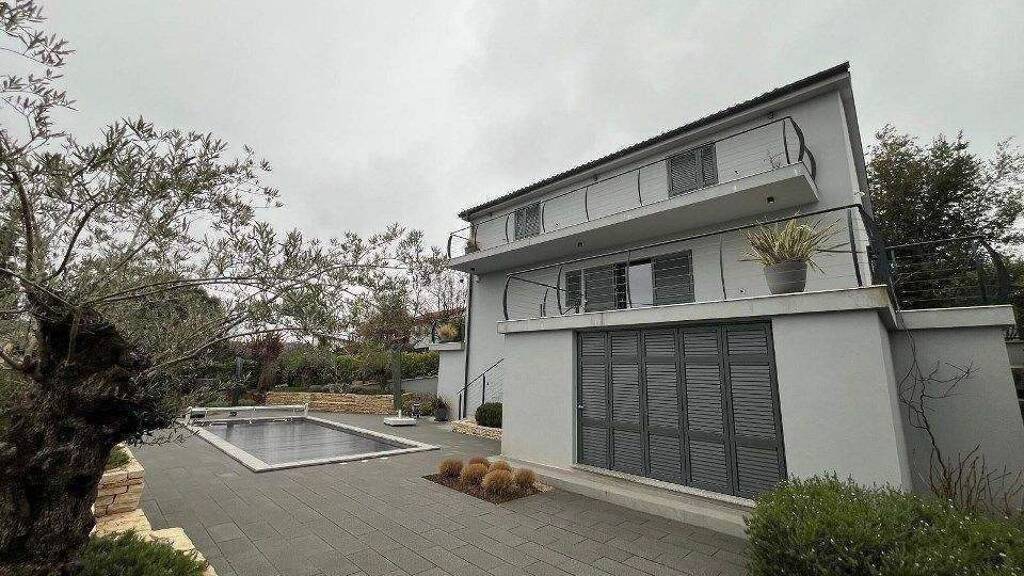 Schoener Neubau (Fertigstellung 2023) mit freiem Blick in die Ferne, in Donja Hlapa auf der Insel Krk, 4 Schlafzimmer mit en suite Badezimmer, grosses Wohnzimmer mit offener Kueche und Austritt auf die 29m2 Terrasse und einen Balkon, moderner Stil, alles sehr elegant ausgefuehrt. Erdgeschoss: 60,2 m2 Wohnfläche + 29,1 m2 Terrasse + 17,5 m2 Baklon 1. Obergeschoss: 48,29 m2 Wohnfläche + 15,9 Abstellfläche + 17,8 m2 Balkon Einliegerwohnung ca. 20m2 Sommerküche ca. 20 m2 Aufenthaltsraum mit Sauna ca. 20m2 Sehr schönes grosszügiges Pool mit automatischer Abdeckung. Außerst geschmackvolle Gartengestalltung alles sauber angelegt, Carport, das Meer ist in 1,5km erreichbar. Hier arbeiten Sie das ganze Jahr im Homeoffice, in mediterranem Klima, in diesem noblen Haus auf Krk. Sind Sie bereit fuer ein perfektes Inselleben in Kroatien, dann rufen Sie uns an!
