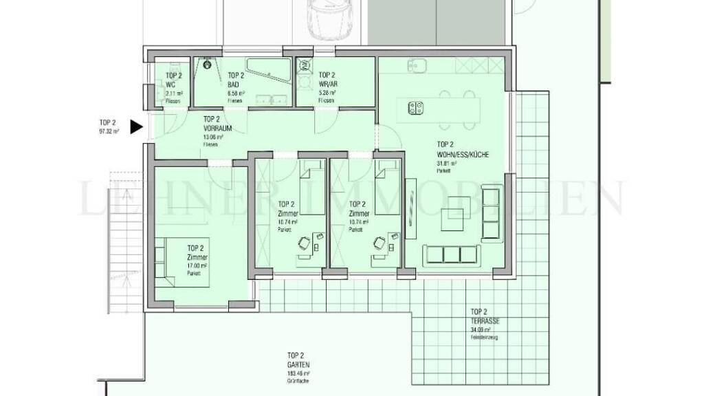 Eckdaten: Erstbezug, 97 m² Wohnfläche, 4 Zimmer, 183 m² Eigengarten, 34 m² Südterrasse, hochwertige DAN-Küche inkl. Essplatz und zwei Carportabstellplätze sind im Kaufpreis enthalten, 15 m² Kellerabteil, perfekte Raumaufteilung, Bauweise Ziegelmassiv plus 16 cm Wärmedämmung, Flächenbündige Innentüren mit Magenschloss, 2,80 Raumhöhe, Smart-Home-System, Luftwärmepumpe-Fußbodenheizung, Kunststoff-Alufenster mit Dreifachverglasung, elektrische Raffstores, Betriebskosten inkl. Rücklage € 388,48. HWB 49 kWh/ m²a, fGEE:0,70.