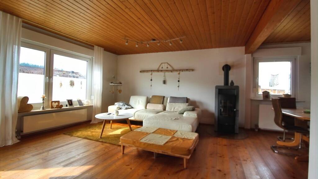 - großzügiges Wohn- und Esszimmer mit Parkettboden, Holzofen und direktem Zugang zur sonnigen, nach Süden ausgerichteten Terrasse