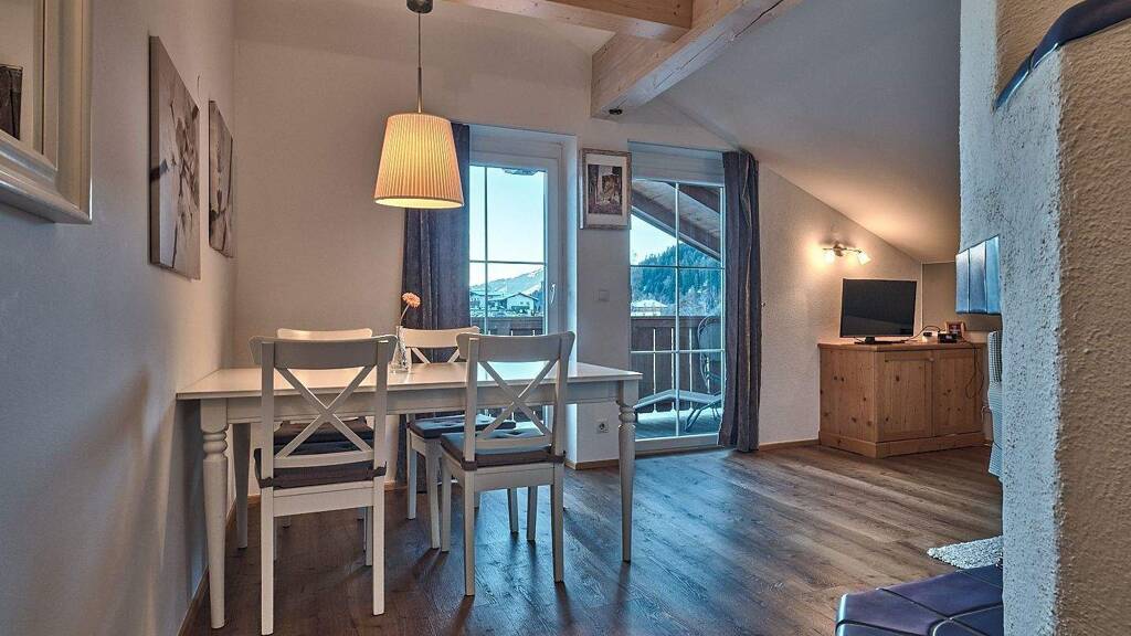 Der stilvolle Wohn- und Essbereich mit Kamin schafft eine warme, einladende Atmosphäre und eröffnet einen wunderschönen Blick auf die umliegende Bergwelt. Das Schlafzimmer verfügt über ein elegantes Bad en Suite mit großzügiger Badewanne und vermittelt höchste Ruhe sowie Privatsphäre. Ergänzt wird die Raumaufteilung durch ein separates Gäste-WC. Eine Fußbodenheizung in allen Räumen sorgt ganzjährig für behagliche Wärme.