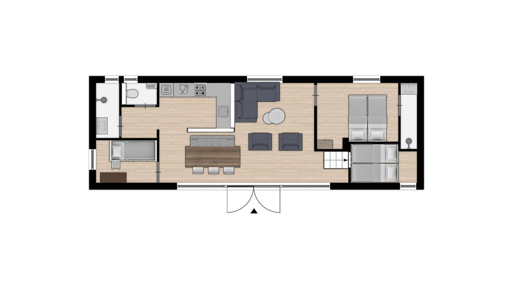 Die Küche ist in einer Ecke angeordnet. Die schönen, glatten, taupefarbenen Küchenschränke passen perfekt zur Atmosphäre des Hauses, schlicht und doch gemütlich. Die Küche ist natürlich mit einem Kühlschrank mit Gefrierfach, Geschirrspüler, Kombi-Mikrowelle, Induktionskochfeld ausgestattet und die schwarze Dunstabzugshaube vervollständigt das Bild.