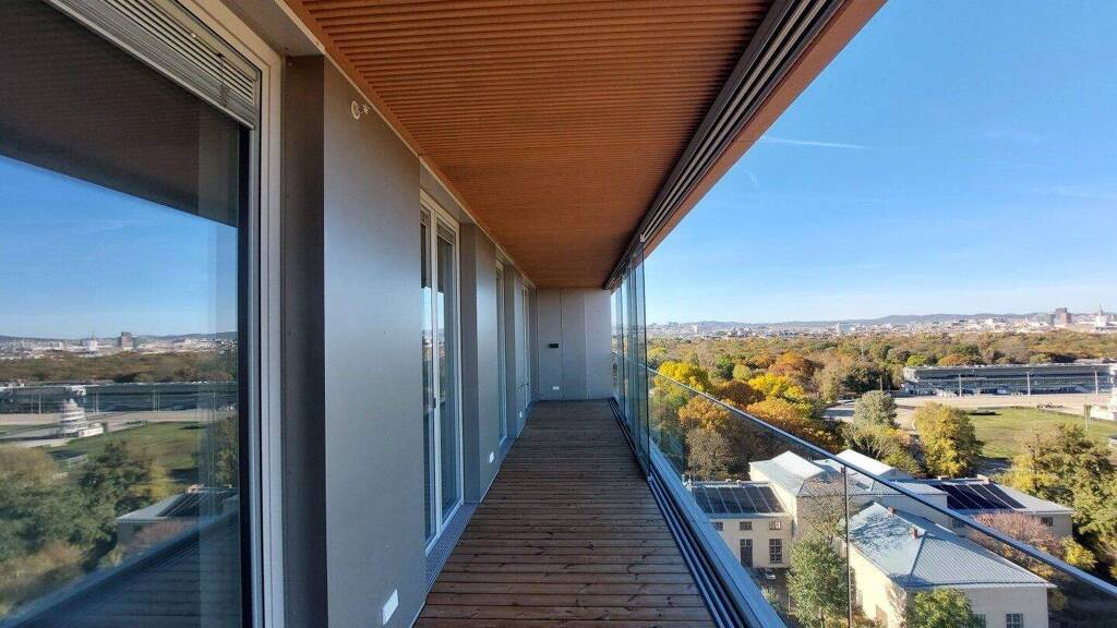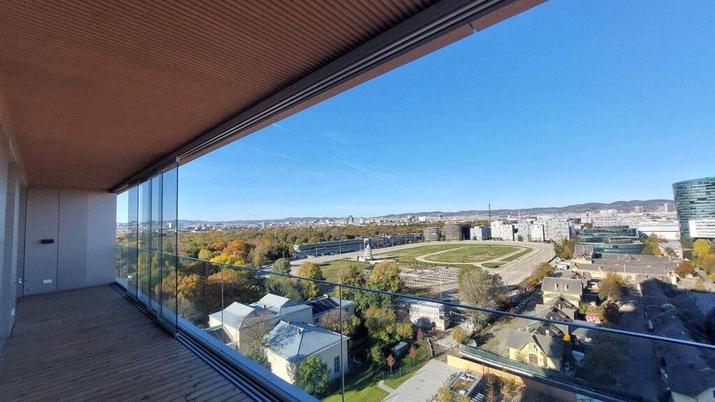 Ein weiteres Highlight ist die Freifläche, von der sich nicht nur ein herrlicher Blick über die Trabrennbahn, sondern auch ein weiter Blick über die Stadt eröffnet - vorbei am ehrwürdigen Rathaus, dem stolzen Stephansdom und bis hin zum lebendigen Prater - die 20 m² große Loggia erweitern den Wohnraum nach draußen und machen den Alltag luftiger: Frühstück in der Morgensonne, ein Glas Wein am Abend oder ein Rennen auf der Trabrennbahn Krieau.