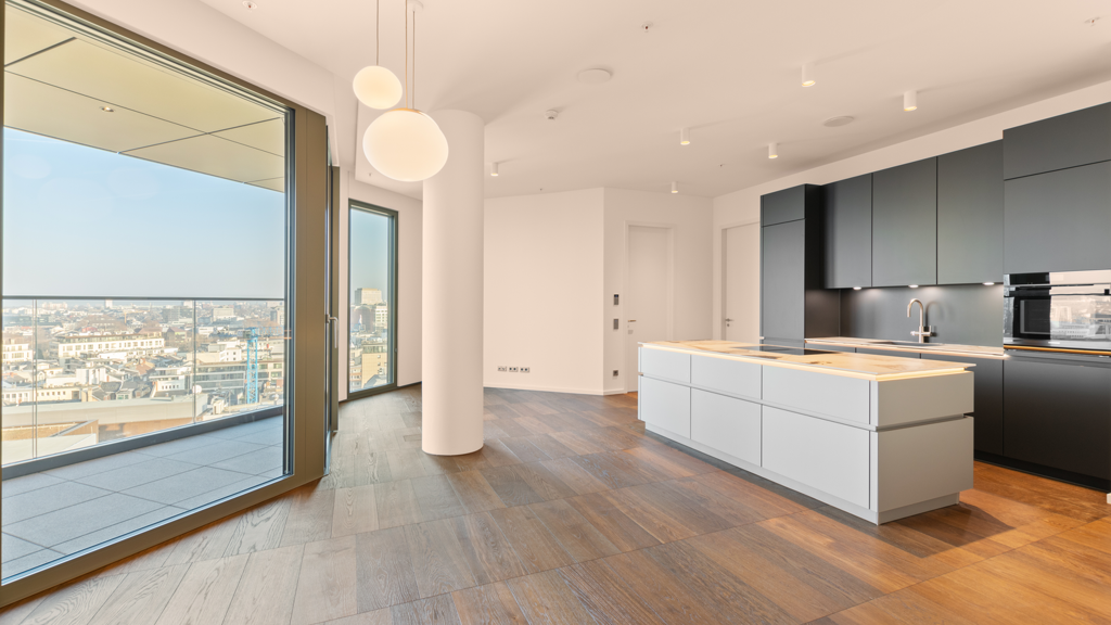 Die Wohnung befindet sich im 12. Obergeschoss des Wohnturms T3 und bietet Ausblicke über die Innenstadt, auf die Alte Oper, sowie auf den Hochhausdschungel. Die West-Ausrichtung garantiert spektakuläre Abendstunden.