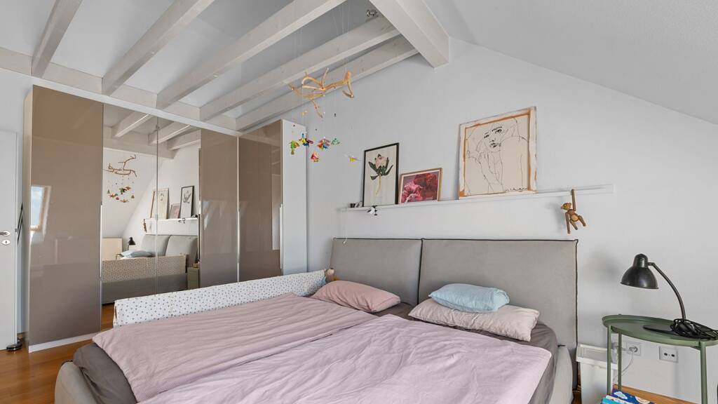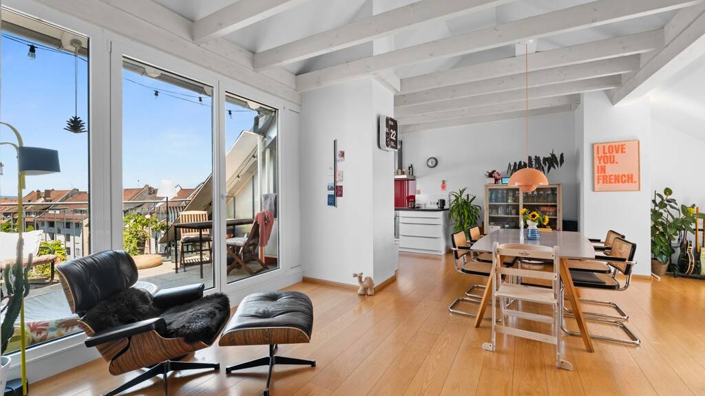Im Herzen der Wohnung lädt ein eleganter Schwedenofen zu gemütlichen Stunden ein, während die großzügige Loggia einen perfekten Rückzugsort bietet, um die Sonne zu genießen und den Alltag hinter sich zu lassen.