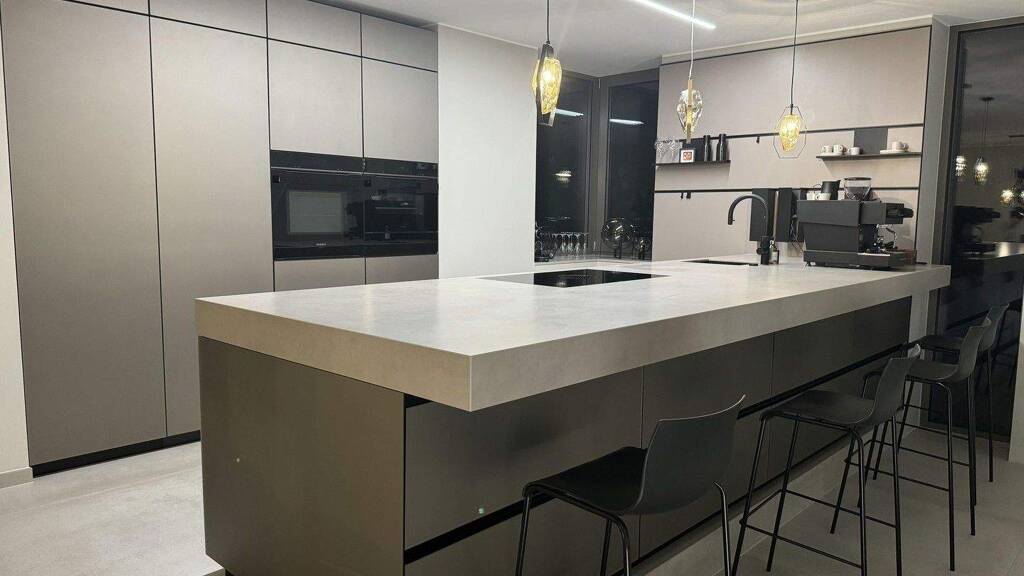 Eine Ebene weiter oben gelangt man in das Herzstück des Hauses. In einer wunderschönen Designer Küche mit Blick in den Himmel freut man sich regelrecht darauf los zu kochen. In dieser Küche wurde an alles bis ins kleinste Detail gedacht. Beispielsweise bekommen Sie über den Quooker kochendes und gesprudeltes Wasser direkt aus dem Wasserhahn ohne schwere Kisten ins Haus schleppen zu müssen. Sperrige und unschöne Küchengeräte verstecken Sie einfach in der Vorküche die bequem durch die Hochschrankzeile zu erreichen ist, sodass die sonderangefertigte Kücheninsel immer erstrahlt.