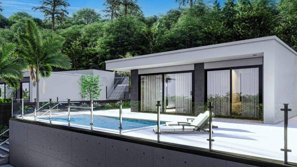 Auf dem 300 m² großen Grundstück befindet sich ein spektakulärer 6 x 3 Meter großer Swimmingpool mit Vorinstallation für eine Heizung, sodass Sie zu jeder Jahreszeit ein Bad genießen können. Die Terrassen neben dem Pool sind durch elegante Glasgeländer geschützt und bieten einen sicheren und stilvollen Ort zum Entspannen und Bewundern der Landschaft.