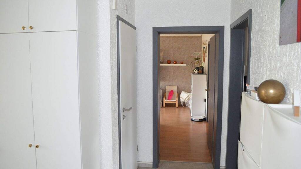 Durch die Eingangstüre gelangen Sie in den Flur von wo aus rechts eine Treppe zum Obergeschoss führt. Geradeaus teilt sich der Gang zur rechten und linken Seite. Auf der rechten Seite befindet sich ein Zimmer, welches als Büroraum oder Gästezimmer genutzt werden kann. Nebenan ist ein Gäste WC. Rechts gelegen finden Sie dann das großzügige Tageslicht-Badezimmer, welches mit einer Dusche und Wanne ausgestattet ist.