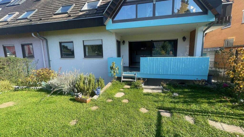 Vom hellen Wohnzimmer aus gelangen Sie direkt auf den Balkon, von dem aus ein direkter Zugang zum großen, umzäunten, gepflegten Garten besteht - ideal zum Entspannen für Kinder oder gesellige Abende im Freien. Zur Wohnung gehören zwei Außenstellplätze sowie ein geräumiger Kellerraum und der obengenannte große Garten.