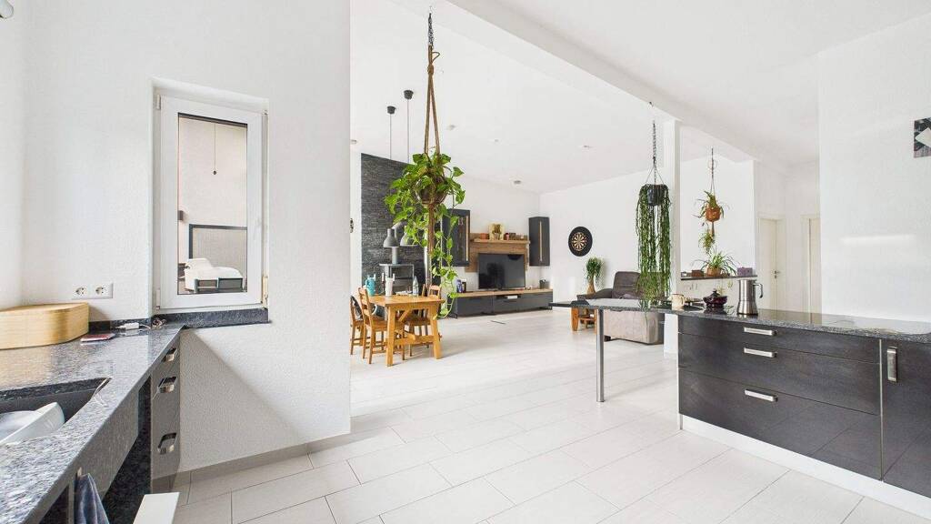 Der offen gestaltete Grundriss verbindet diesen Bereich harmonisch mit der modernen Einbauküche, die bereits im Kaufpreis enthalten ist und allen Ansprüchen an zeitgemäßes Wohnen gerecht wird.