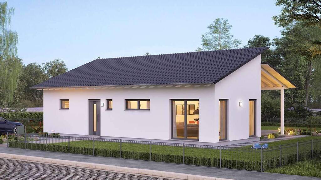 Der attraktive Bungalow ComfortStyle 10.02 P mit Pultdach bietet ideenreichen Baufamilien auf 108 m² viele Möglichkeiten, die eigenen Vorstellungen umzusetzen. Ein echtes Highlight ist die überdachte Terrasse mit direktem Zugang aus dem großzügigen Wohn-, Ess- und Küchenbereich. An schönen Tagen lässt sich so der Wohnraum ins Freie hinaus verlängern. Daneben erhöhen das geräumige Bad und viele intelligent integrierte Stellflächen oder Stauräume den individuellen Wohnkomfort. Nicht zuletzt überzeugt das ComfortStyle 10.02 P mit einer klaren, geradlinigen Architektursprache.