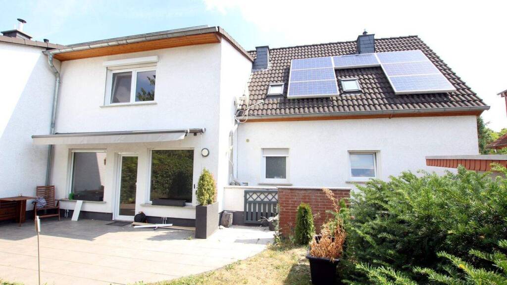 Reihenhaus 2: Baujahr ca. 1995. Die ca.100 m² verteilen sich auf 1,5 Geschossen und liegen inmitten einer grünen Oase. In das Reihenmittelhaus gelangen Sie über eine massive Steintreppe mit Edelstahlgeländer direkt in die Diele. Von dort kommen Sie in das geräumige Wohn-/Esszimmer mit großen Fenstern und Zugang zur Terrasse und in den Garten. Weiter geht es von dort in die Küche (inkl. Einbauküche aus ca. 2011) mit angrenzendem Abstell- /Waschraum und in das separate Gäste-WC. Eine Stahl-Holztreppe verbindet das Erdgeschoss mit dem Dachgeschoss. Dort befindet sich ein großes Schlafzimmer mit genügend Platz für Schränke (Ankleidebereich), ein Raum für ein Kinderzimmer oder Büro sowie ein Badezimmer mit Dusche und Badewanne. Überall durchfluten große Fenster die Räume mit viel Licht. Vom Flur aus gibt es einen Zugang über eine Auszieh-Treppe zum Dachboden der viel Stauraum bietet. Der Spitzboden ist nicht ausgebaut. Ein besonderes Highlight ist die Terrasse (überdacht durch eine große moderne Markise) mit umzäuntem Garten. Der Garten ist ruhig gelegen und kaum einsehbar. Die hochwertigen Keramik-Outdoor Fliesen wurden 2018 verlegt und sind pflegeleicht. Es gibt außerdem einen separaten Zugang zum Garten über einen kleinen Hof mit Stellfläche für Fahrräder und Zugang zu einem Kellerraum. Der Garten, mit Süd-West-Sonne, ist eine wahre grüne Oase und wird Naturfreunde begeistern. Ein idealer Platz zum Abschalten nach langen Arbeitstagen. Vor dem Haus gibt es 1-2 Stellplätze. Zur Ausstattung: - Photovoltaik-Anlage 9KW seit 2016 (Neupreis 16.000 Euro, ohne Speicher) zur Selbstnutzung und Einspeisung (Vergütung läuft über EVM), WallBox ist geplant - geht über beide Hausdächer. - Einbauküche 2011 - Vinylböden / Fliesen, Wandbelag 2018 - Umzäunter Garten mit Terrasse 2018 und großer moderner Markise 2017 - Gartenhaus für Gartengeräte 2017 - Badezimmer möbliert 2011 - Dachboden- Kellerraum- Außenstellplatz direkt vor dem Haus - Kunststoff-Fenster 2-fach verglast 2020 - Aluminium Haustür mit automatischer Verriegelung und Edelstahlgriff 2020 - Stahl-Holztreppe mit Edelstahl Handlauf - Gas-Brennwert-Thermen aus 2024 - Durchlauferhitzer für Warmwasser