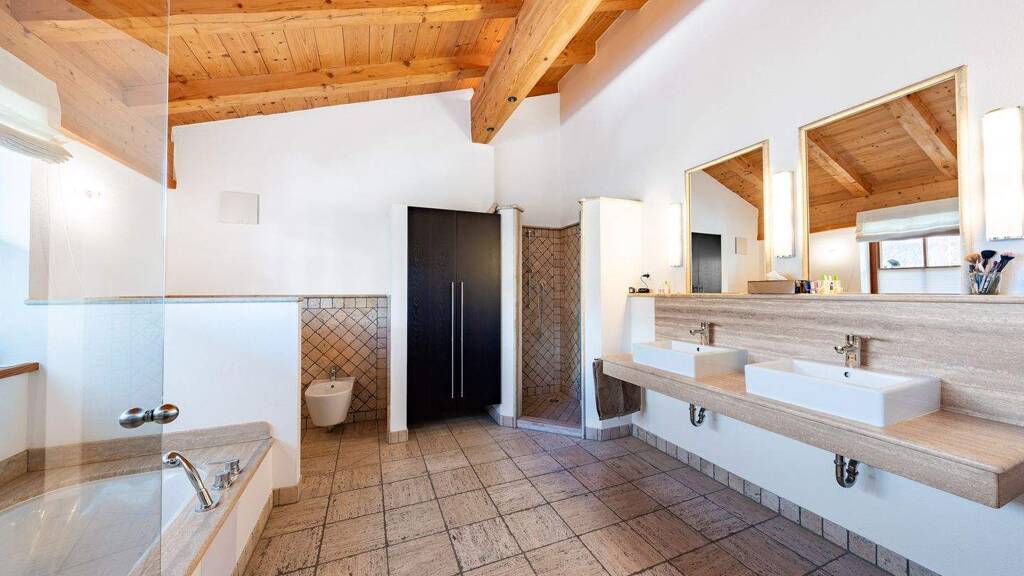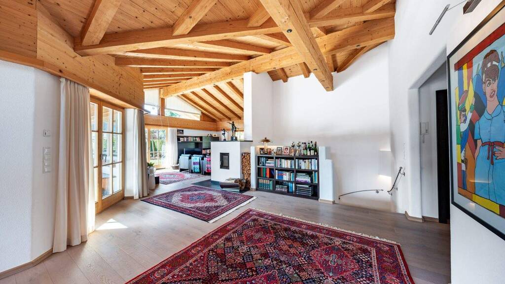 Diese exklusive Immobilie erstreckt sich über drei Etagen und besticht durch ihre lichtdurchflutete Architektur, großzügige Raumgestaltung und hochwertige Ausstattung. Große Fensterfronten lassen viel Tageslicht herein und schaffen eine fließende Verbindung zwischen Innen- und Außenbereich. Im ersten Obergeschoss bildet der offene Wohnbereich das Herzstück des Hauses. Der elegante Sichtdachstuhl, der das gesamte OG durchzieht, und der offene Kamin verleihen dem Raum eine warme, einladende Atmosphäre, während die großen Fensterfronten einen beeindruckenden Blick auf die umliegende Berglandschaft bieten. Die angrenzende Südterrasse mit Garten lädt zum Verweilen ein und erweitert den Wohnraum nach draußen. Die moderne Küche mit separater Back-Kitchen fügt sich harmonisch in den offenen Essbereich ein. Das Hauptschlafzimmer auf dieser Etage bietet höchsten Komfort mit eigenem Ankleidebereich und einem luxuriösen Badezimmer mit Doppelwaschbecken, Badewanne und Dusche.