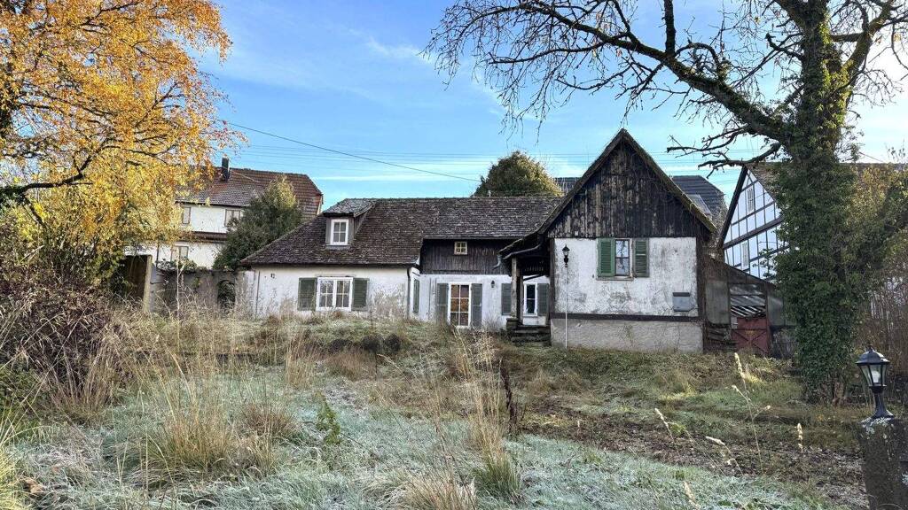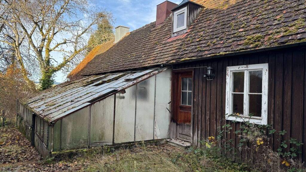Auf dem Gelände einer ehemaligen Gärtnerei befindet sich dieses außergewöhnliche Einfamilienhaus, das mit seinem besonderen Charakter und seinem großen Potenzial überzeugt. Rechts neben dem Wohnhaus steht noch das sanierungsbedürftige Gewächshaus. Es kann weiterhin als Gewächshaus genutzt werden - alternativ ist auch eine Nutzung als Atelier oder Hobbybereich denkbar. Das Wohnhaus ist über Eck gebaut, wodurch ein geschützter und sehr gemütlicher Terrassenbereich direkt vor dem Wohnzimmer entsteht. Im Erdgeschoss befinden sich auf ca. 110 m² das helle Wohnzimmer, ein Schlafzimmer mit anschließendem Badezimmer sowie die Küche und drei weitere Zimmer. Das modernisierte Badezimmer verfügt über ein Fenster, eine große Eckbadewanne, ein WC und ein Waschbecken. Für Gäste gibt es eine separate Toilette. Das Obergeschoss ist nicht in der Wohnfläche eingerechnet und umfasst auf ca. 60 m² Grundfläche einen offenen Vorraum, ein weiteres großes Schlafzimmer sowie einen niedrigeren Nebenraum, der sich ideal als Abstellraum, Hobbyraum oder zusätzlicher Wohnbereich anbietet. Das Gebäude ist teilunterkellert. Hier sind auch die Ölzentralheizung (defekt) und die dazugehörigen Tanks untergebracht. Im gesamten Haus finden sich zahlreiche stilprägende Elemente aus der Zeit des Wiederaufbaus, die dem Gebäude einen unverwechselbaren Charakter verleihen: Echtholz-Einbauschränke, massive Holztüren, handgeschmiedete Türbeschläge und Solnhofer Platten sorgen für eine warme und behagliche Atmosphäre, die erhaltenswert ist. Das Dach ist älteren Datums, zeigt jedoch keinerlei erkennbaren Feuchteschäden. Die Zufahrt zum Haus erfolgt über eine parkähnliche Einfahrt. Der Garten wurde in den letzten Jahren nur grundlegend gepflegt, zeigt aber bereits jetzt sein großes Potenzial und lässt sich mit überschaubarem Aufwand wieder in eine grüne Oase verwandeln.