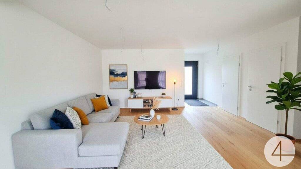 In der unteren Etage befindet sich ein geräumiges Wohnzimmer, das nahtlos in den Essbereich übergeht. Diese offene Gestaltung fördert die Kommunikation und schafft einen einladenden Raum für Familien und Gäste. In Ihrer zukünftigen Küche können Sie ideal für die Zubereitung von Speisen sorgen, und bietet gleichzeitig Zugang zu einer Terrasse mit Gartenbereich, der zum Entspannen und Verweilen einlädt. Große Fensterfronten sorgen für eine helle und freundliche Umgebung, während die offenen Wohnkonzepte sowohl Funktionalität als auch Stil vereinen.