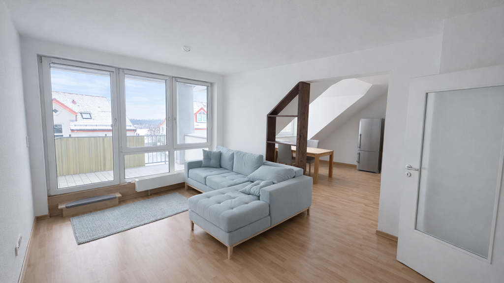 Diese Wohnung richtet sich an Singles oder Paare, die bewusst ruhiger und ländlicher wohnen möchten, ohne auf die Nähe zur Stadt zu verzichten. Durch die Lage im obersten Stockwerk überzeugt sie mit viel Tageslicht, einer schönen Aussicht und einem großzügigen Balkon mit Weitblick, der dem Alltag spürbar mehr Ruhe und Qualität verleiht.
