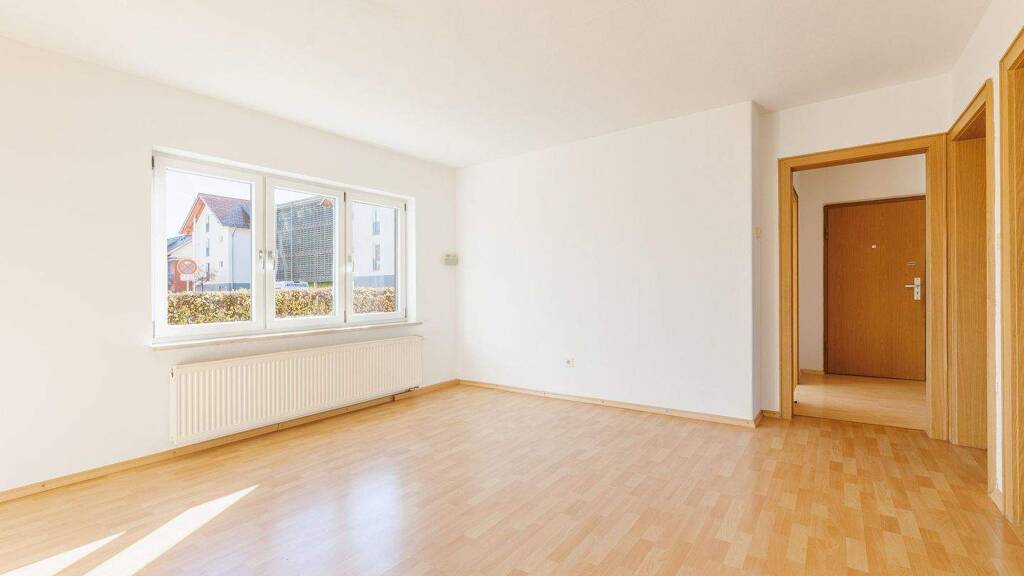 Die Dreizimmerwohnung befindet sich im Hochparterre eines 1956 gebauten Mehrfamilienhauses und umfasst circa 61 Quadratmeter (m²) Wohnfläche. Ein Flur führt reihum in alle Zimmer: Wohnesszimmer, Küche und zwei Schlafzimmer - davon eines nach Westen und eines nach Osten hin ausgerichtet. Die Küche kann nach den Wünschen der Bewohner gestaltet werden; eine Einbauküche ist nicht vorhanden. Es gibt weder Balkon noch Terrasse, dafür aber ein eigenes 16-Quadratmeter-Gartenabteil. Das Bad ist mit einer ebenerdig zugänglichen Dusche, Waschbecken, Handtuchtrockner, Fenster und WC ausgestattet und zeitlos hell gefliest. Zur Wohnung gehören sowohl ein Außenstellplatz als auch ein Kellerabteil (10 m²), in dem sich die eigene Gasbrennwerttherme (Baujahr: 1993) befindet.