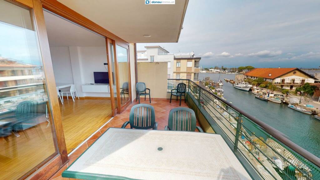Diese Maisonette-Wohnung befindet sich im Zentrum von Grado, direkt am alten Hafen von Grado. Das Zentrum und der Strand sind nur wenige Gehminuten vom Appartement entfernt. Von der Terrasse bietet sich ein schöner Blick auf die Lagune von Grado und den Fischerhafen. Die zweigeschossige Wohnung befindet sich in der dritten Etage des aus vier Etagen bestehenden Gebäudes. Im Untergeschoss befindet sich der Eingang und eine geräumige Wohnküche, ein Badezimmer und eine große Terrasse. Über eine Treppe gelangt man ins Obergeschoß mit zwei Schlafzimmern, einem Badezimmer und einer weiteren Terrasse.