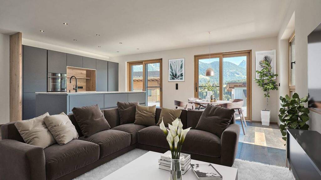 In sonniger Panoramalage mit Blick auf die umliegende Bergwelt entstand ein außergewöhnlicher Wohnkomplex mit zwei eleganten Maisonette-Wohnungen und einem exklusiven Penthouse.