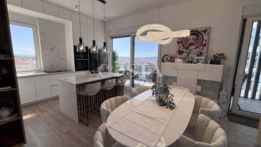 Möbliertes Penthouse in Vidikovac bei Zadar zur Langzeitmiete. Diese luxuriös ausgestattete Wohnung befindet sich im dritten Stock eines Wohnhauses mit Aufzug. Die 118,82 m² große, vollklimatisierte Wohnung mit Fußbodenheizung verfügt über ein Wohnzimmer, eine Wohnküche, zwei Schlafzimmer, zwei Badezimmer, eine Loggia und eine Terrasse.