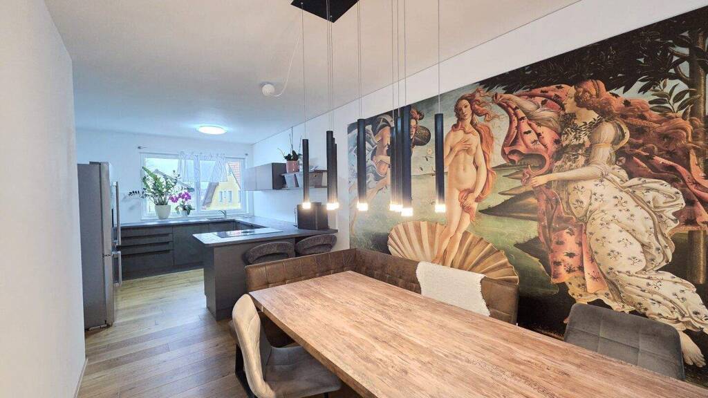 Über eine geradlinige Treppe gelangen Sie vom Untergeschoss in das Erdgeschoss, in den zentralen Wohnbereich der Einheit. Hier erwarten Sie ein großzügiger Wohn- und Essbereich mit Klimaanlage und offener, moderner Einbauküche, zwei Schlafzimmer, ein großes Badezimmer mit WC, Badewanne und Dusche sowie ein Gang mit integriertem Einbauschrank, der zusätzlichen Stauraum bietet. Vom Wohn-Essbereich sowie von einem der Schlafzimmer kommt man ganz bequem auf die Terrasse samt Grünfläche, wobei die Terrasse mit einer Pergola ausgestattet ist.