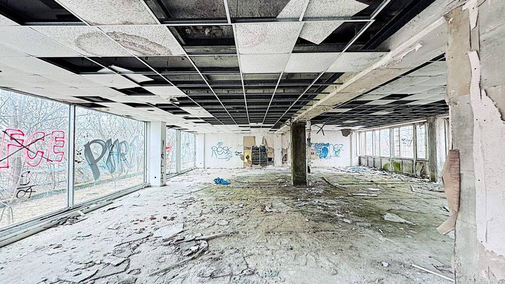 einen Parkplatz, einen überdachten Fahrradständer sowie Gehwegbefestigungen. Das Bürogebäude ist komplett leerstehend und der Innenausbau durch Vandalismus stark beschädigt bzw. unbrauchbar. Insgesamt befindet sich das Objekt