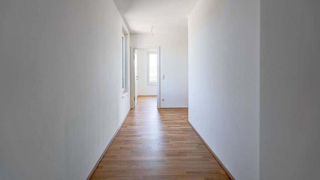 Im Vorraum angekommen, gelangen Sie geradeaus in das erste Zimmer, weiters gelangen Sie durch den Flur in den Abstellraum sowie in das WC mit Handwaschbecken und das Bad mit Dusche und Waschmaschinenanschluss.