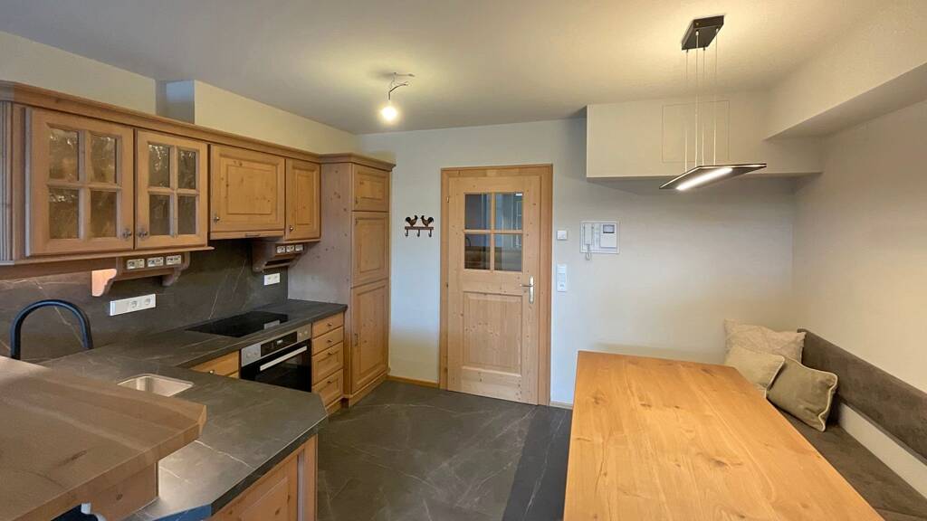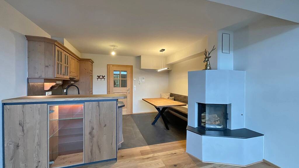Der großzügige Wohn- und Essbereich besticht durch seine lichtdurchflutete Atmosphäre und seine elegante Gestaltung. Die offene Holz-Einbauküche ist ein Meisterwerk des Designs und lässt Sie kulinarische Köstlichkeiten in einem wunderschönen Ambiente zubereiten. Der Kamin sorgt für eine romantische und gemütliche Atmosphäre, die Sie in kühlen Nächten genießen können.