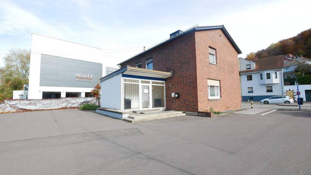 Die angebotene Immobilie ist eine ehemalige Praxisfläche im Erdgeschoss eines zweistöckigen Gebäudes.