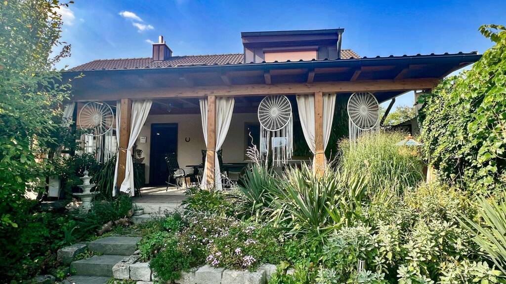 Die sonnige Terrasse geht fließend in den harmonisch gestalteten Garten über und lädt zu entspannten Stunden mit Familie und Freunden ein.