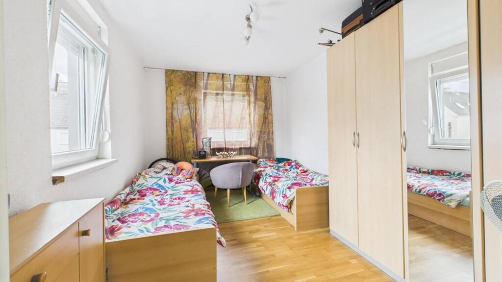 - Im Erdgeschoss befinden sich ein großzügiges Wohnzimmer mit Kaminofen, eine separate Küche sowie ein modernisiertes Badezimmer mit WC.