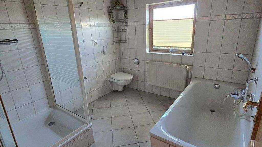 Ein modernes, gut ausgestattetes Badezimmer erfüllt alle Ansprüche. Zudem profitieren Sie von der massiven Garage mit einer zusätzlichen Nutzfläche von ca. 25 m² sowie einer schönen Terrasse, die ideal für entspannte Stunden im Freien geeignet ist.