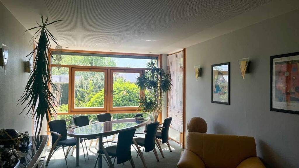 Im Erdgeschoss befindet sich eine große Gewerbefläche mit 3 repräsentativen Büros, Besprechungsraum und Empfangsbereich. Außergewöhnlich ist dabei der große, modern ausgestattete Konferenzraum.
